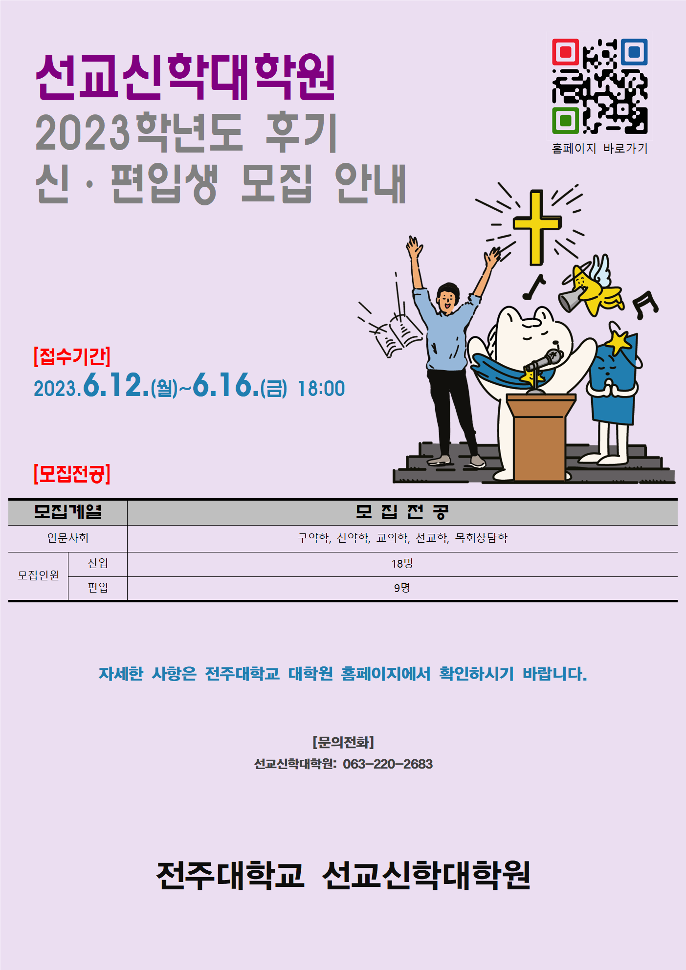 | 선교신학대학원 | [모집예정] 2026-1학기 선교신학대학원 신·편입생 특별전형 모집요강 | 관리자 | 25-10-02 | 161 |