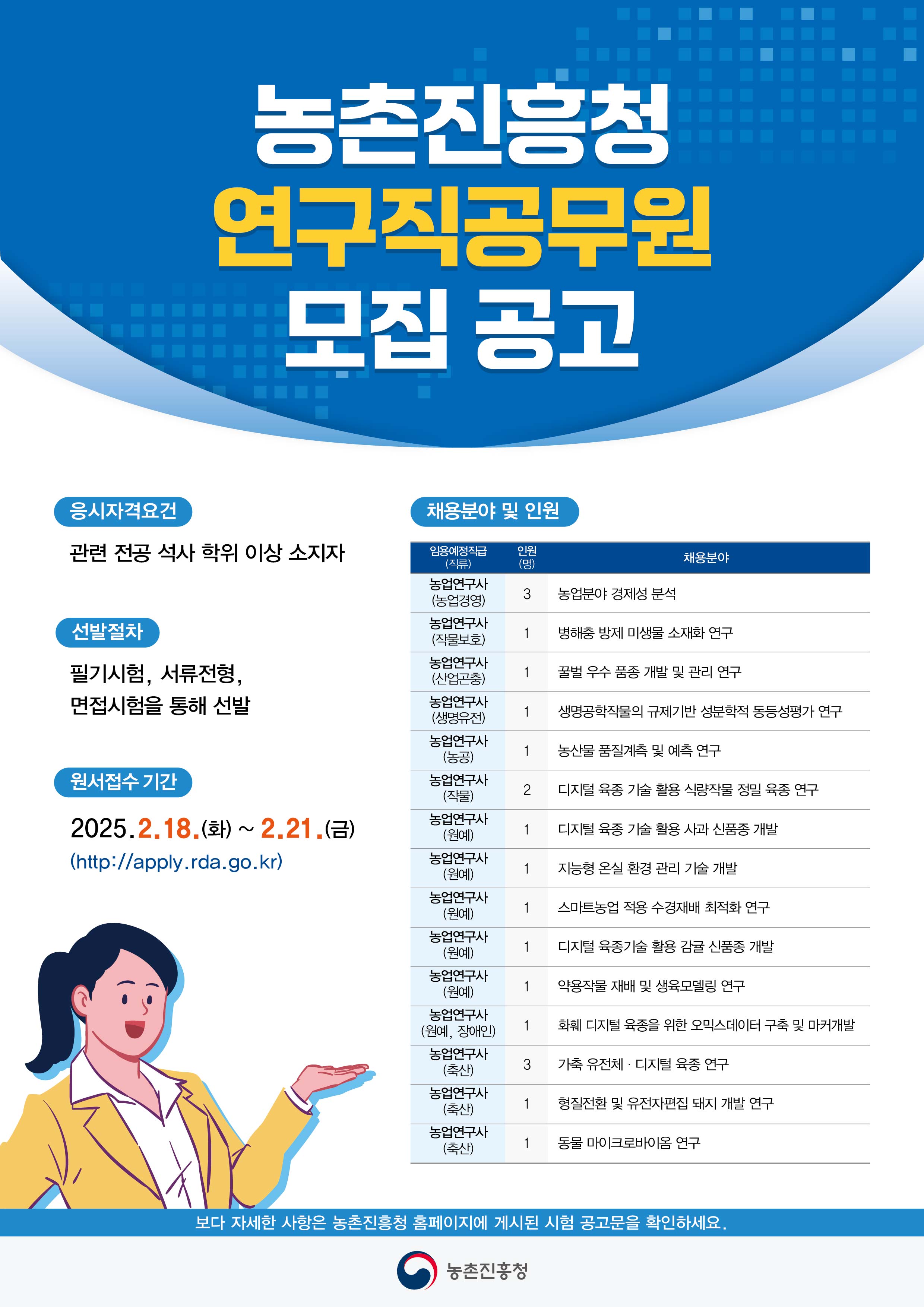 71 농촌진흥청 연구직 공무원 경력경쟁채용 공고 관리자 25-01-20 364   2025 연구직 경력경쟁채용 모집 공고 포스터.jpg